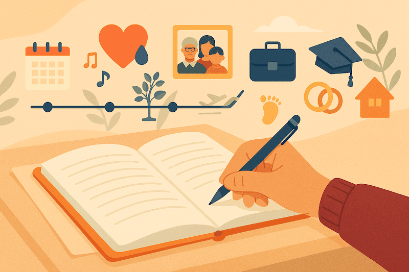 誕生、入学、卒業、就職、結婚、家族の出来事、引っ越し、趣味や旅行など、思い出せることを一つずつ記入してください。